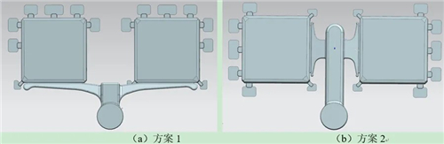 The router cover is a shell-type aluminum alloy die casting part, and there are holes to be made on three sides, that is, a three-sided core-pulling mechanism is required. Therefore, only the inner gate should be set on the side without core-pulling, as shown in Figure 1. The Toyo BD-250V5 is adopted, and the projected area of the die casting part is 158cm2. One mold with two cavities is selected, and two process schemes are designed, as shown in Figure 2.