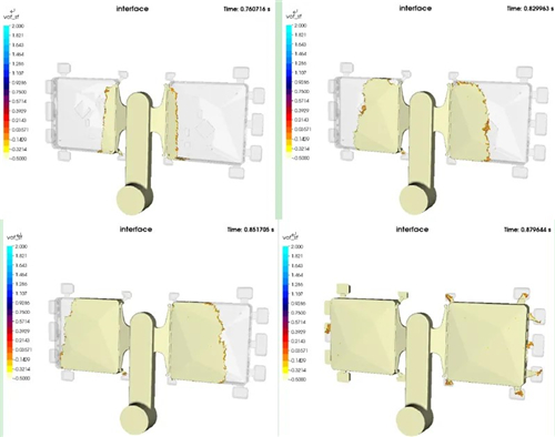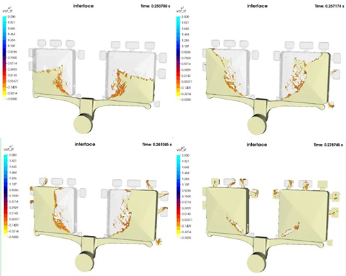 The numerical simulation results of the filling process of scheme 1 are shown in Figure 3. It can be seen that since the cross gate and the inner gate are arranged at the lower part of the cavity, the molten aluminum alloy first fills both sides of the cavity after the molten aluminum alloy filling the cavity. The flow of the molten aluminum alloy on the inner side is turbulent and easy to cause defects such as gas entrainment and inclusions, as shown in Figure 3. The final filling part of the molten aluminum alloy is on the lower corner of the inner side, and it is inside the casting, not in the overflow tank, so that the molten aluminum alloy with cold pollution at the front end cannot enter the overflow tank, and remains inside the casting. Defects such as cold shuts, gas holes and slag inclusions are prone to appear, as shown in Figure 3d.